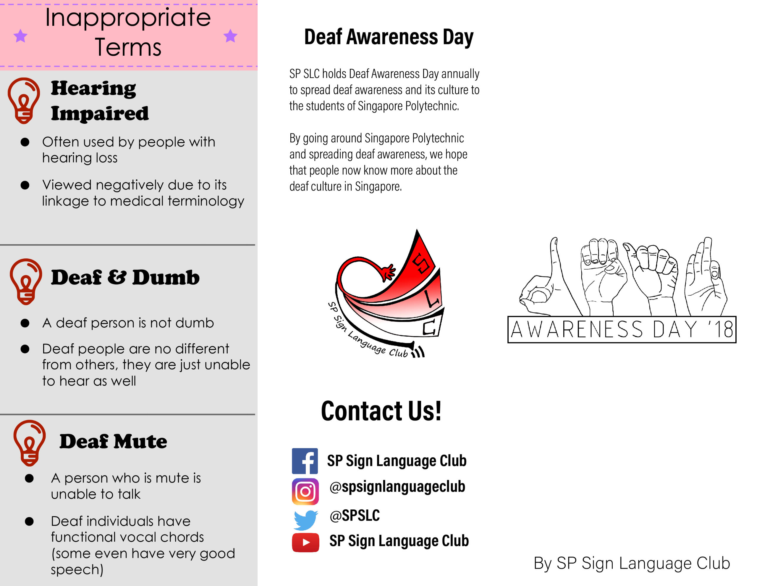 This is a brochure for our Deaf Awareness Day in 2018. The purpose of this brochure is to spread awareness (in Singapore Polytechnic) about the Deaf community in Singapore.