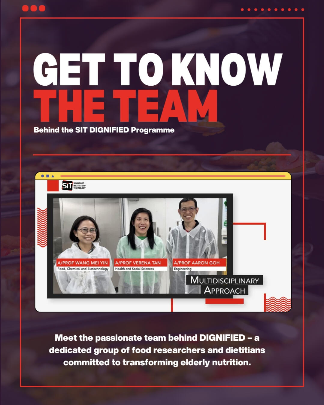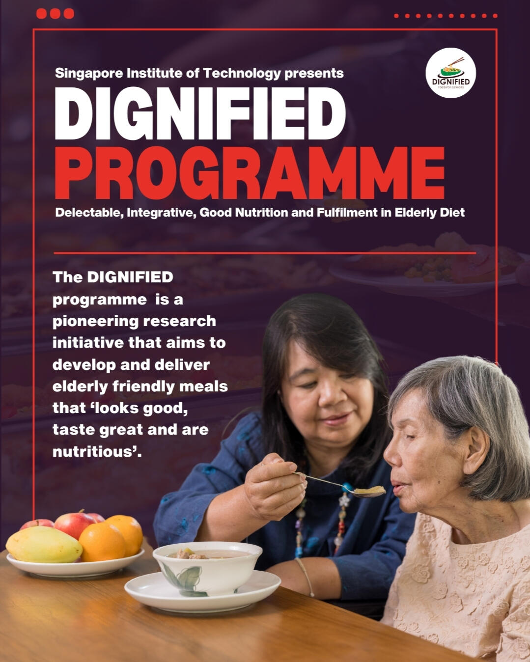DIGNIFIED - Delicious, Integrative, Good Nutrition and Fulfilment in Elderly DietSIT DIGNIFIED PROGRAMME is a is a pioneering research initiative in Singapore Insitute of Techonogy that aims to develop and deliver elderly friendly meals that ‘looks good, taste great and are nutritious’.My social media & content development work consists of creating simple infographics, bite sized fun facts and promotional designs in order to raise the awareness of the DIGNIFIED programme on platforms such as Instagram, Facebook, LinkedIn and YouTube.